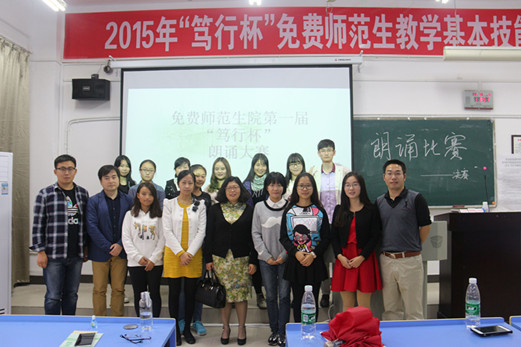 为贯彻落实《江西师范大学师范生教学技能全员测试实施方案》(校发[2015]43号)的文件精神,免费师范生院于11月7日起,举行教师基本技能通关测试暨2015年“笃行杯”教师基本技能竞赛,此次测试共分诗歌朗诵、演讲、三笔字、课堂教学、说课、课件制作等6个子项目,整个测试将持续1个多月,历5个周末,全院共有600多人次参与。