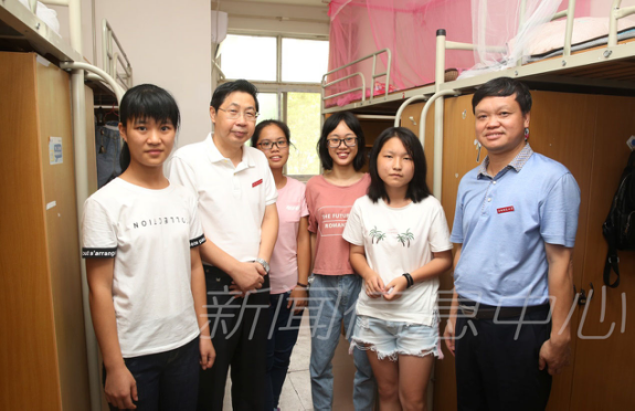 在免费师范生院党总支书记熊吉生及院团委书记王静的陪同下,校党委书记田延光与副校长刘俊来到了今年江西师范大学新生理科最高分、免费师范生院2017级英语专业尹雨晴的寝室。见到学校领导,尹雨晴显得有些紧张,但随着田书记十分亲切地走到她身边,笑容和蔼地同她握手,尹雨晴也开始轻松地和校领导攀谈起来。随后田延光书记与刘俊副校长关切地询问寝室同学们来校后的适应情况,并表达了对同学们进入师大校园的欢迎及期望。最后,校领导们热情邀请寝室新生与他们一起合影,每个人脸上都挂满了笑容。