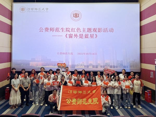 为弘扬航天精神,深化学生的爱国意识和求索精神,10月14日,公费师范生院组织开展了红色主题观影活动。教师教育处处长黄友华老师、党政办主任龚宇辉老师、24级文科辅导员肖祎明老师及30余名学生代表共同观看航天题材影片《窗外是蓝星》。